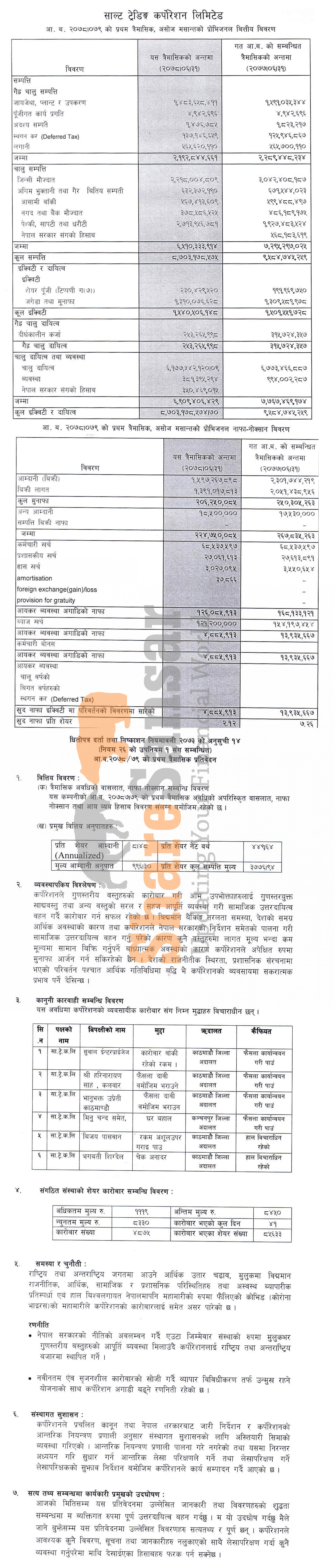 Salt Trading Corporation Limited has posted a net profit of Rs 4.88 million and published its 1st quarter company analysis of the fiscal year 2078/79.