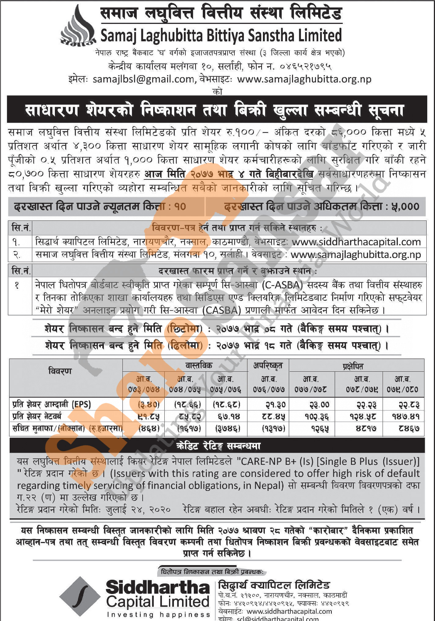 Samaj Laghubitta Bittiya Sanstha Limited is issuing its 86,000 units IPO shares to the general public from today (4th Bhadra, 2077).