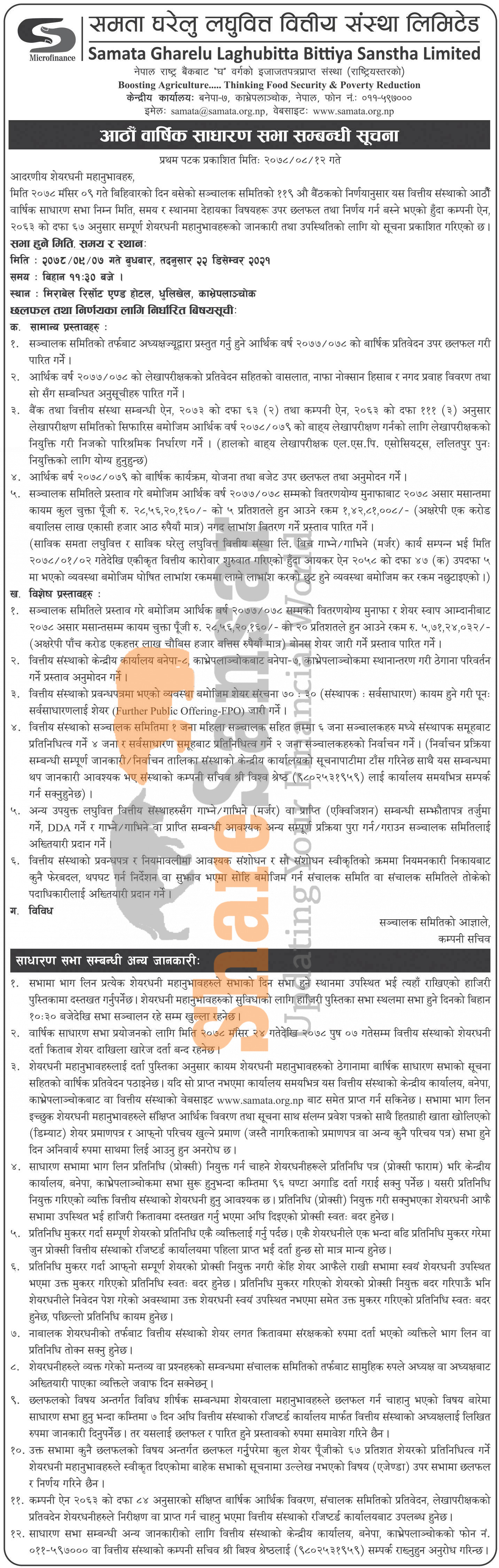 Samata Gharelu Laghubitta Bittiya Sanstha Limited has announced its 8th AGM going to be held on 7th Poush, 2078.