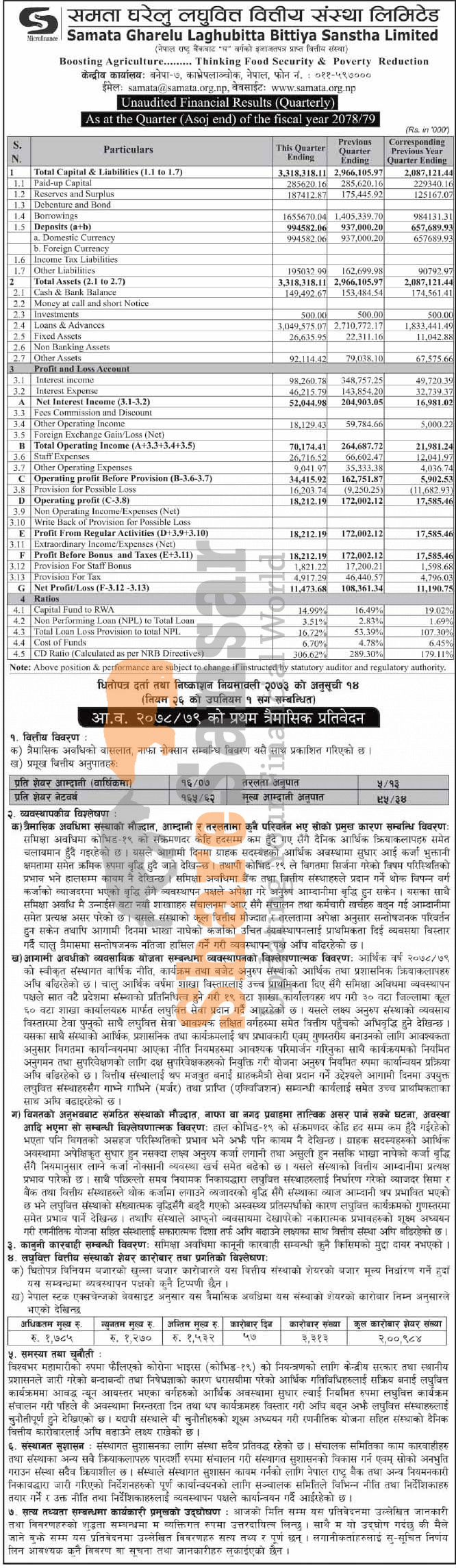 Samata Gharelu Laghubitta Bittiya Sanstha Limited has posted a net profit of Rs 11.47 million and published its 1st quarter company analysis of the fiscal year 2078/79.