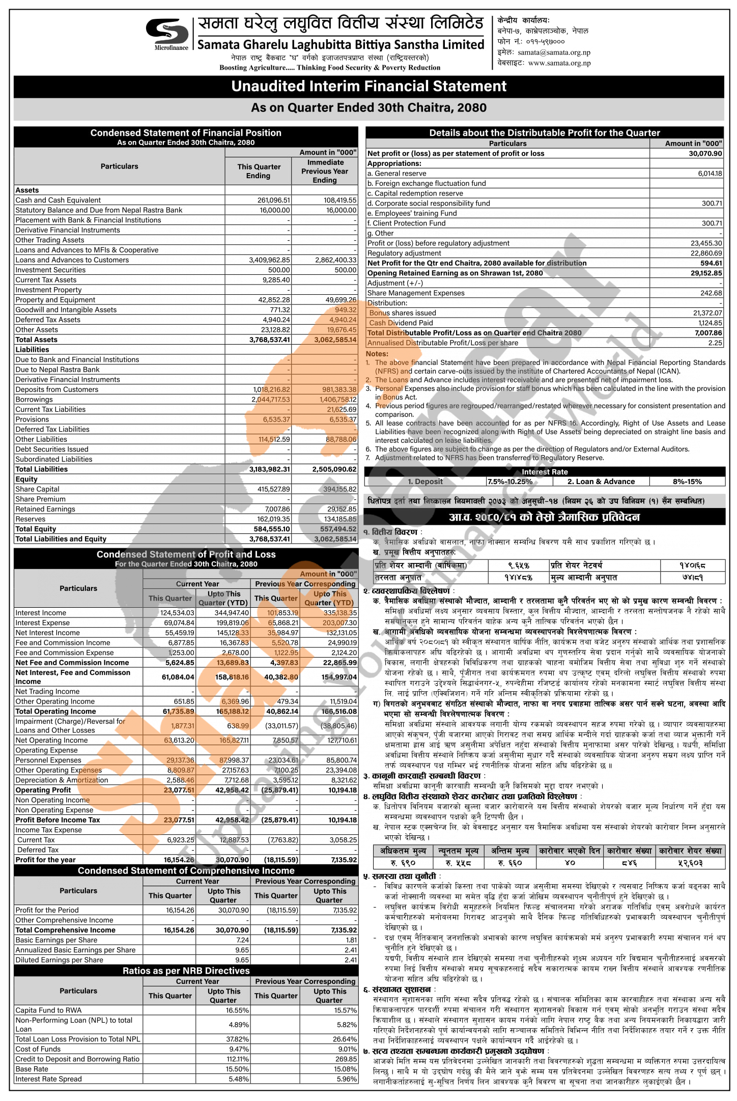 Samata Gharelu Laghubitta Bittiya Sanstha Limited has posted a net profit of Rs 30.07 million and published its 3rd quarter company analysis of the fiscal year 2080/81.