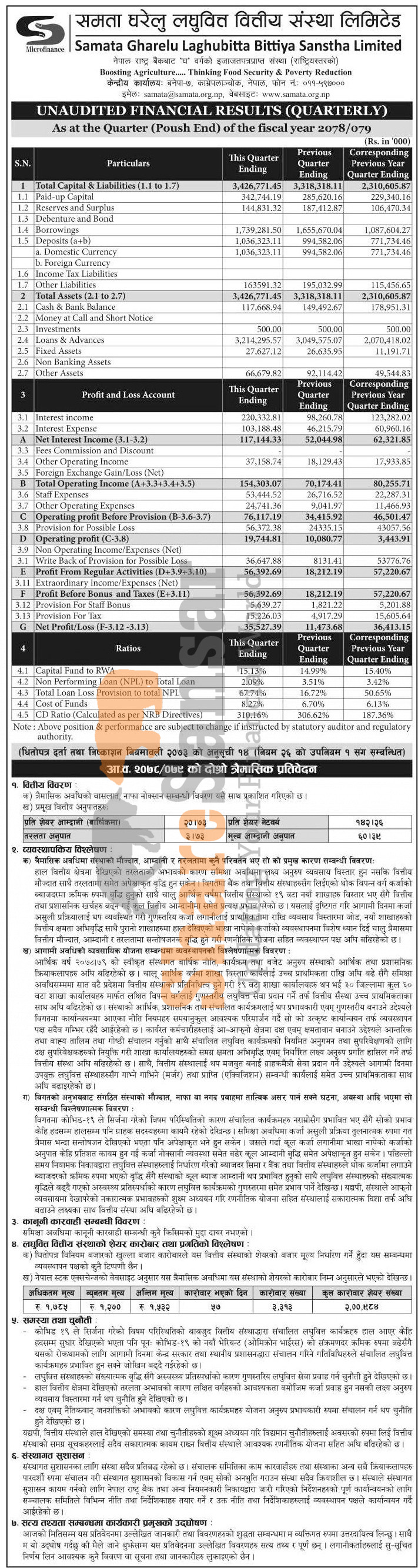 Samata Gharelu Laghubitta Bittiya Sanstha Limited has posted a net profit of Rs 35.52 million and published its 2nd quarter company analysis of the fiscal year 2078/79.