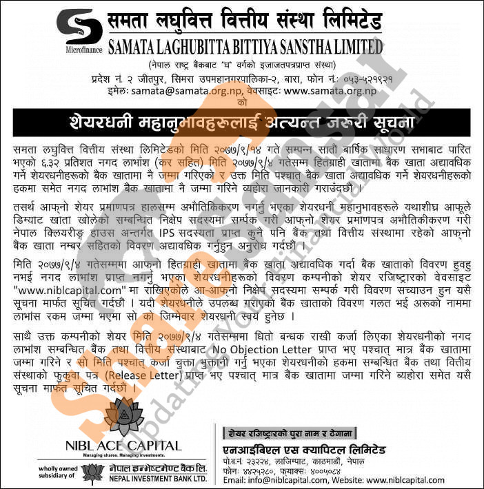 Samata Laghubitta Bittiya Sanstha Limited is distributing 6.32% Cash Dividend directly to bank accounts of its shareholders.