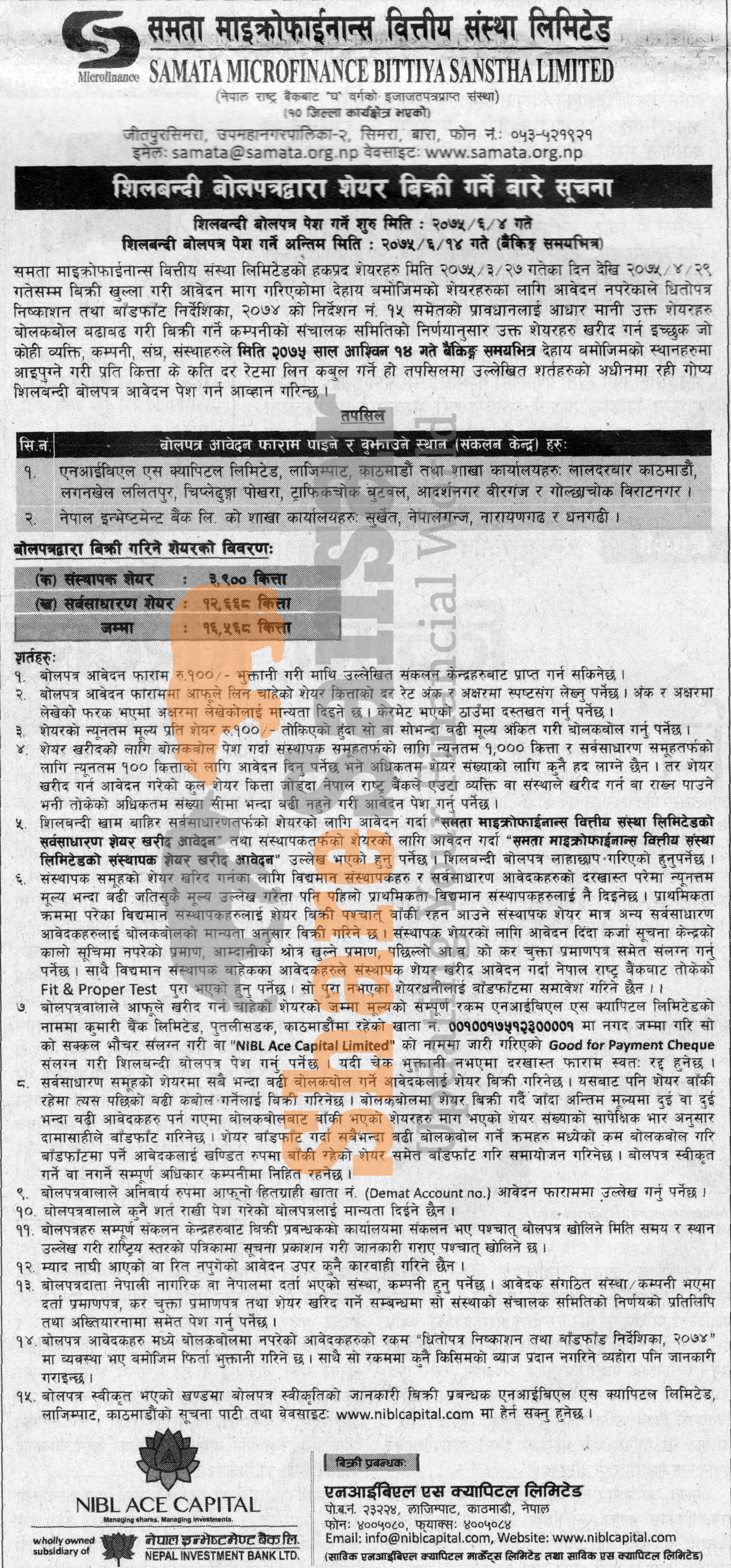 Samata Microfinance Bittiya Sanstha Limited is selling its 12,668 unit ordinary shares and 3,900 unit promoter shares in auction to the general public from (4th to 14th Ashwin, 2075).