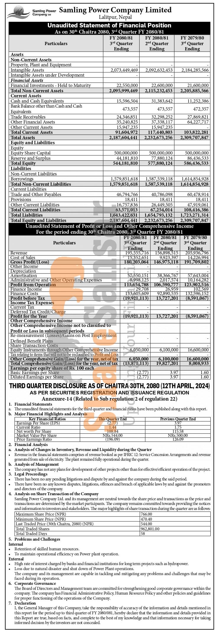 Samling Power Company Limited has posted a net loss of Rs 19.92 million and published its 3rd quarter company analysis of the fiscal year 2080/81.