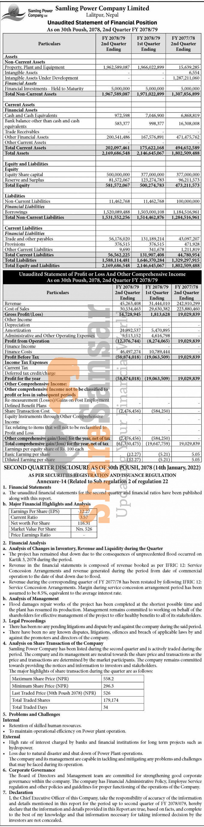 Samling Power Company Limited has posted a net loss of Rs 58.87 million and published its 2nd quarter company analysis of the fiscal year 2078/79.
