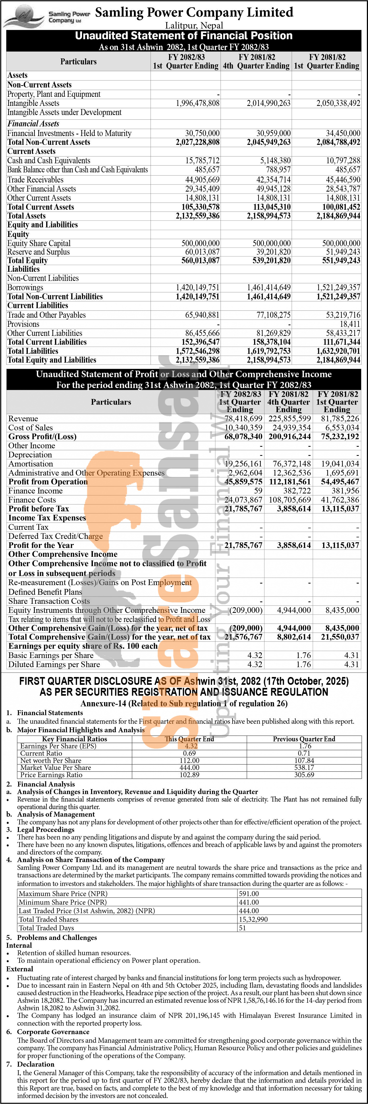Samling Power Company Limited has posted a net profit of Rs 21.78 million and published its 1st quarter company analysis of the fiscal year 2082/83.
