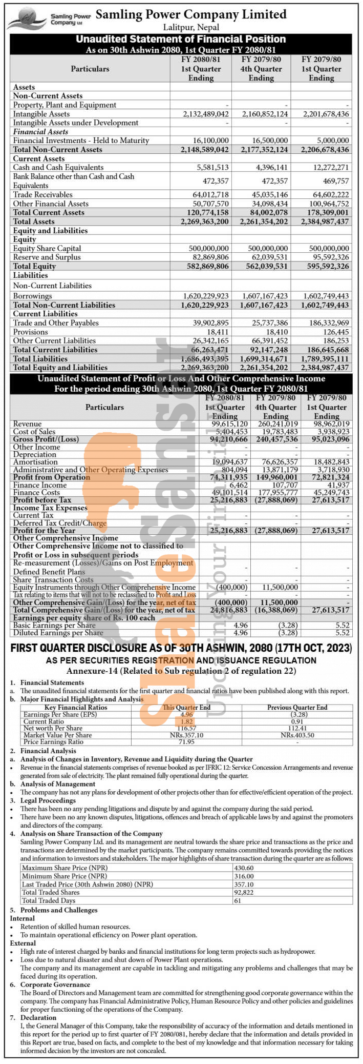 Samling Power Company Limited has posted a net profit of Rs 25.21 million and published its 1st quarter company analysis of the fiscal year 2080/81.