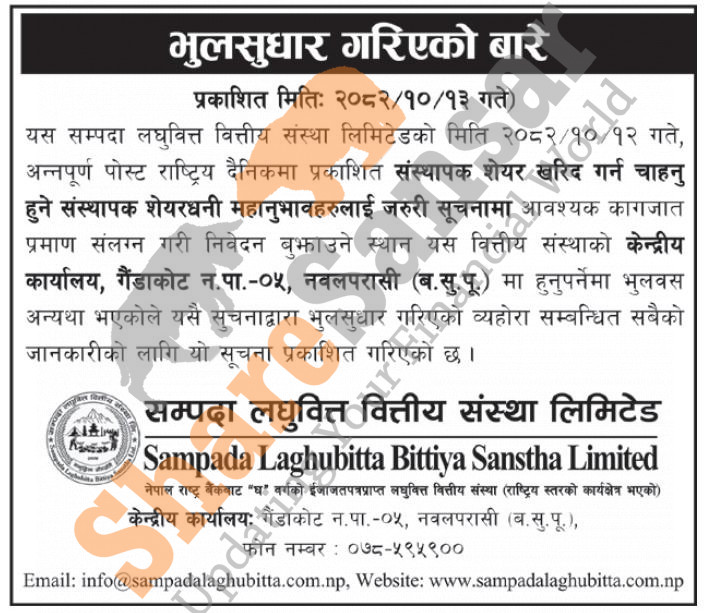 Sampada Laghubitta Bittiya Sanstha Limited has made correction on its auction notice which was published on 12th Magh, 2082.