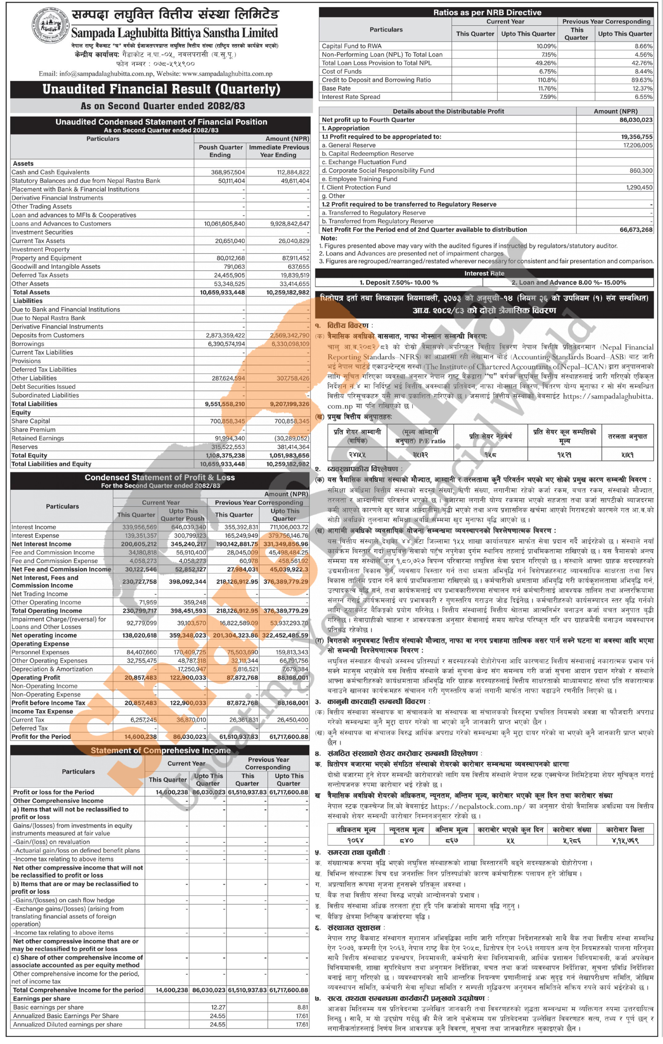 Sampada Laghubitta Bittiya Sanstha Limited has posted a net profit of Rs 86.03 million and published its 2nd quarter company analysis of the fiscal year 2082/83.