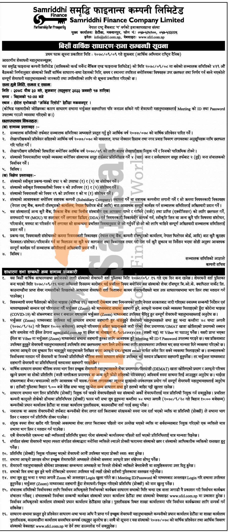Samriddhi Finance Company Limited has announced its 20th AGM going to be held on 30th Poush, 2078.