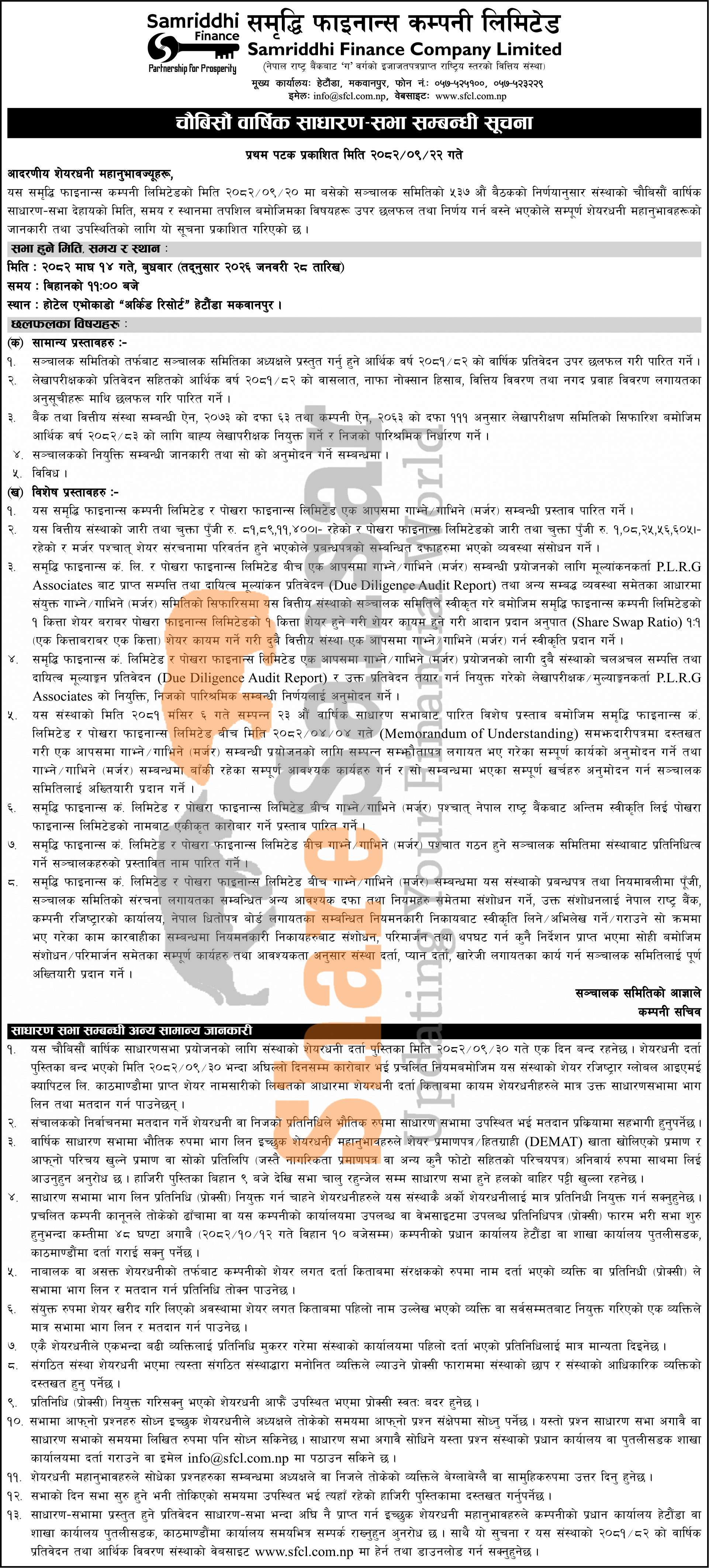 Samriddhi Finance Company Limited has announced its 24th AGM going to be held on 14th Magh, 2082.