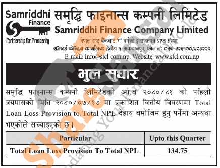 Samriddhi Finance Company Limited has made correction on its 1st quarter company analysis of the fiscal year 2080/81.