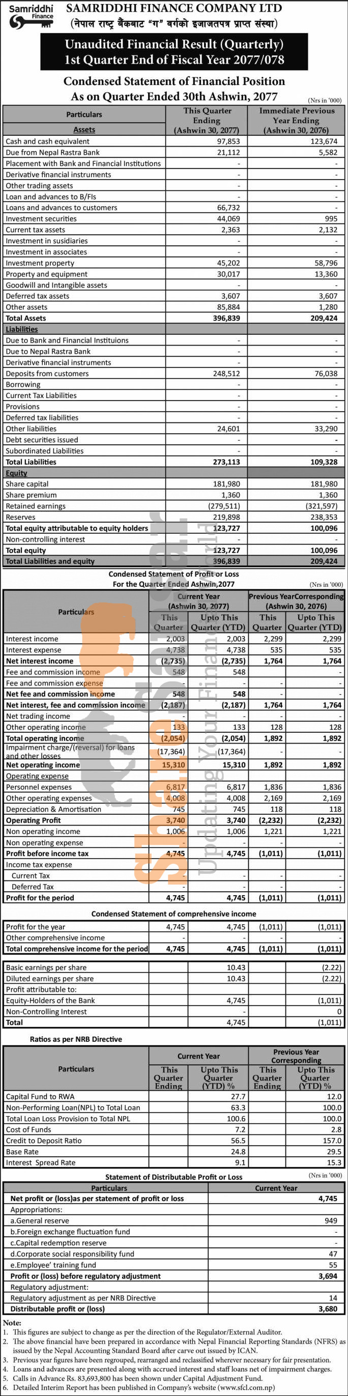 Samriddhi Finance Company Limited has posted a net profit of Rs 4.74 million and published its 1st quarter company analysis of the fiscal year 2077/78.