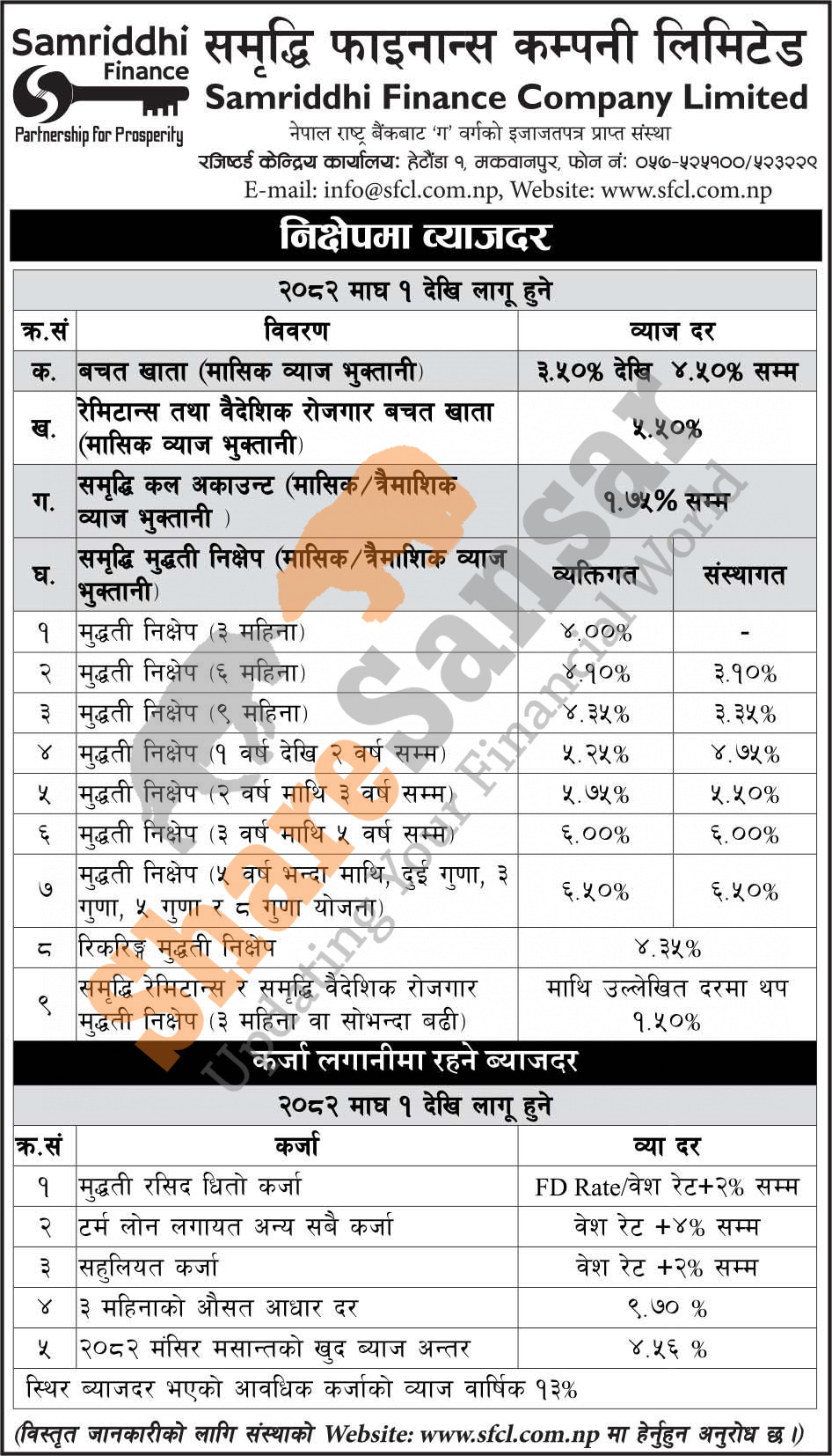 Samriddhi Finance Company Limited has published a notice regarding the new interest rate for deposit and loan products and it's effective from 1st Magh, 2082.