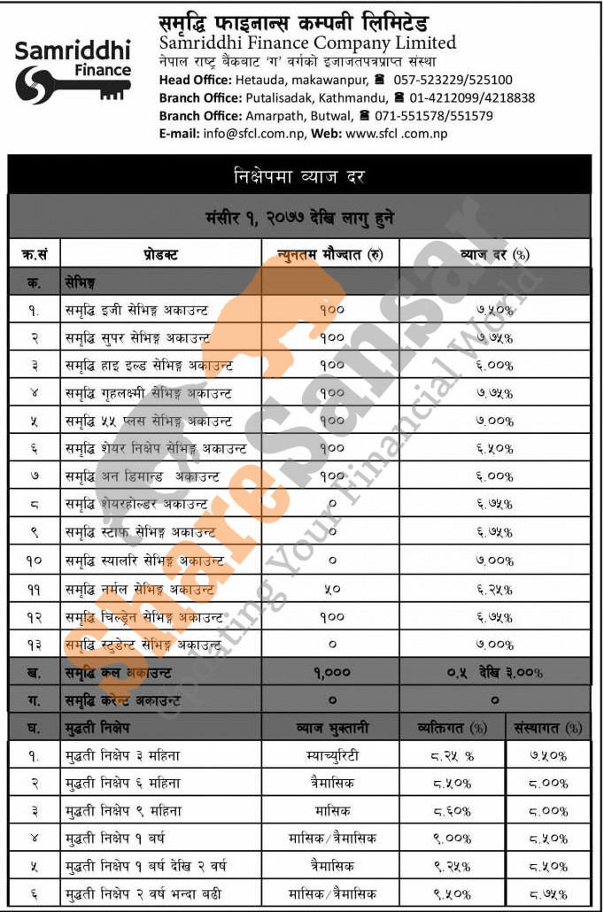 Samriddhi Finance Company Limited has published a notice regarding the new interest rate for its deposit products and it's effective from 1st Mangsir, 2077.