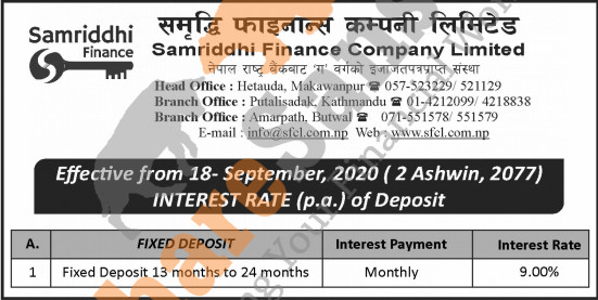 Samriddhi Finance Company Limited has published a notice regarding the new interest rate for its deposit products and its effective from 2nd Ashwin, 2077.