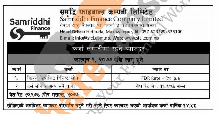 Samriddhi Finance Company Limited has published a notice regarding the new interest rate for loan products and it's effective from 1st Falgun, 2077.