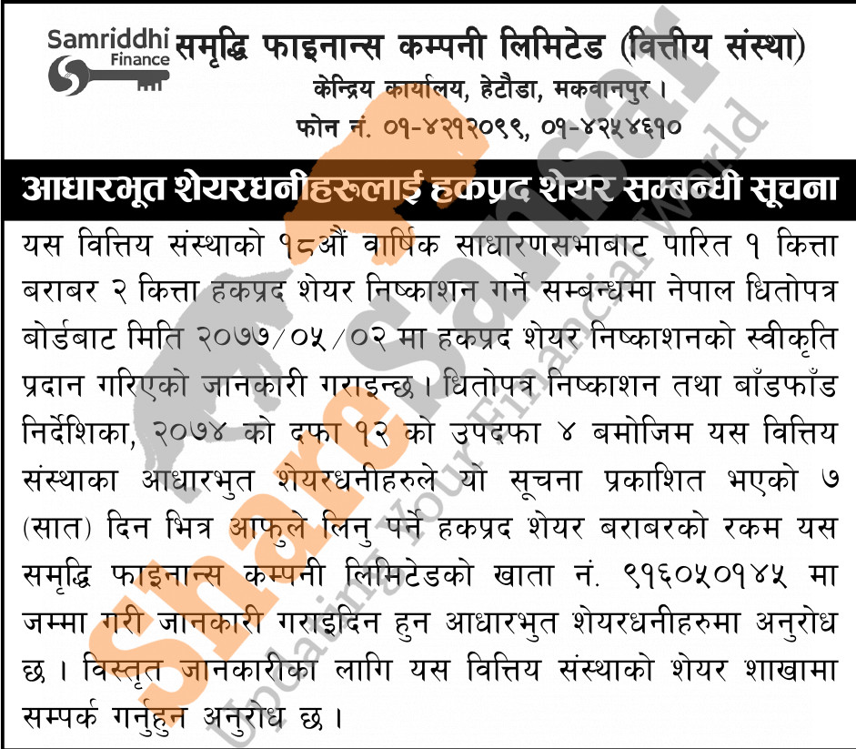 Samriddhi Finance Company Limited has urged its basic shareholders to deposit 1:2 right share amount.