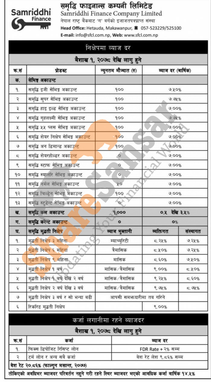 Samriddhi Finance Limited has published a notice regarding the new interest rate for deposit and loan products and it's effective from 1st Baisakh, 2078.