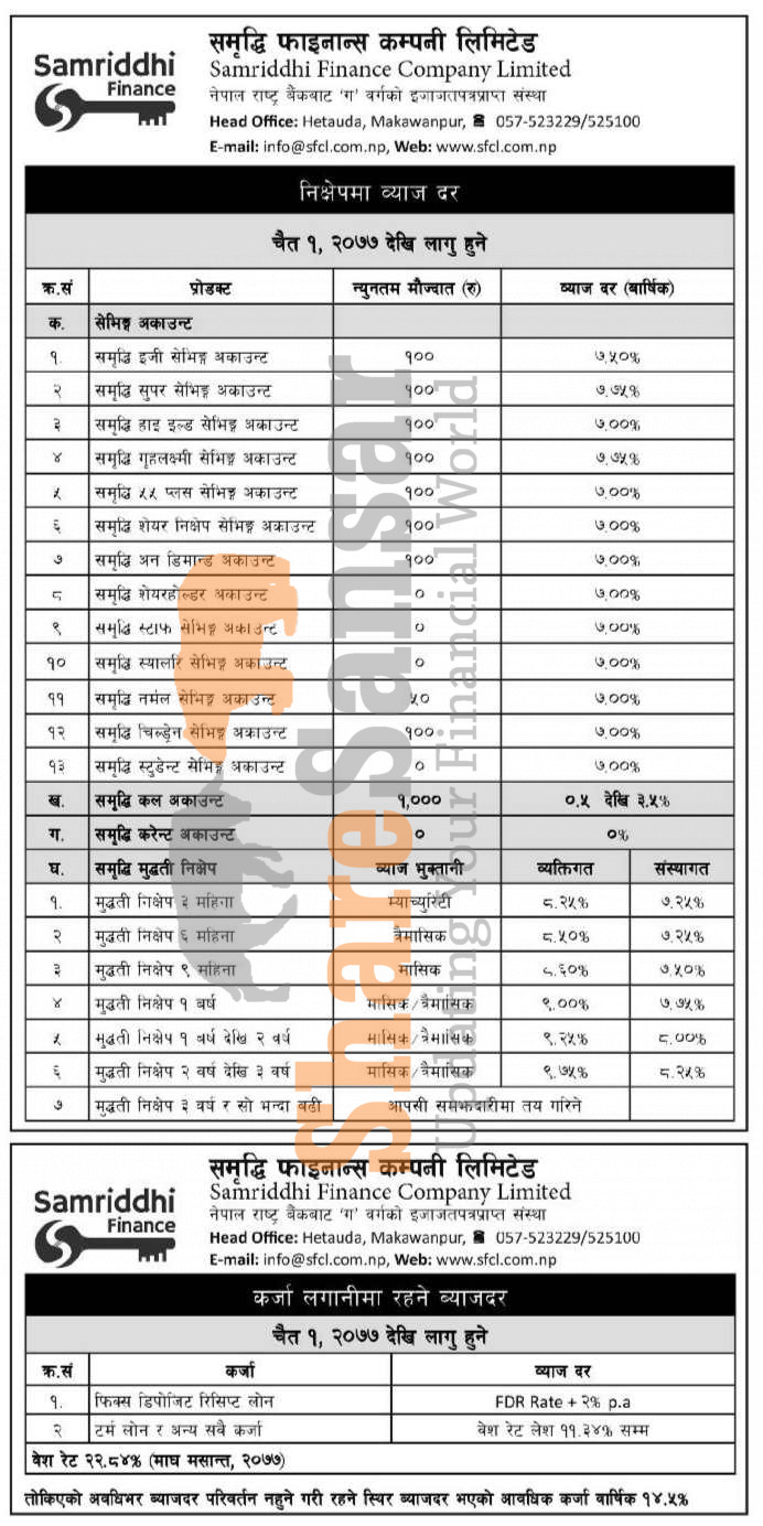 Samriddhi Finance Limited has published a notice regarding the new interest rate for deposit and loan products and it's effective from 1st Chaitra, 2077.