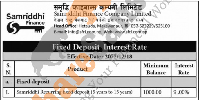Samriddhi Finance Limited has published a notice regarding the new interest rate for deposit product and it's effective from 18th Chaitra, 2077.
