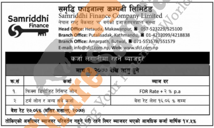 Samriddhi Finance Company Limited has published a notice regarding the new interest rate for loan products and it's effective from 1st Magh, 2077.