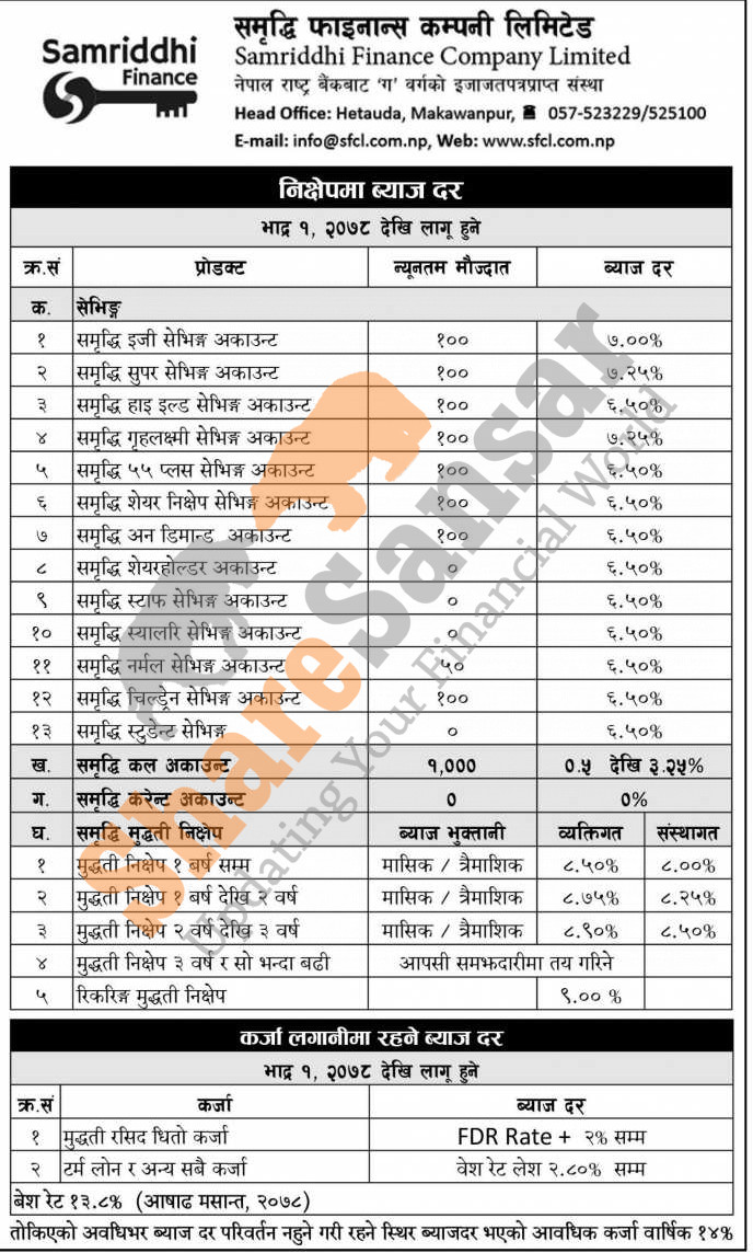 Samriddhi Finance Limited has published a notice regarding the new interest rate on deposit and loan products and it's effective from 1st Bhadra, 2078.