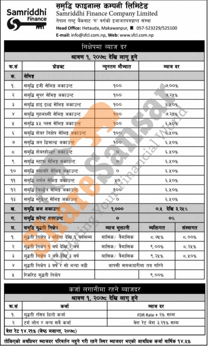 Samriddhi Finance Limited has published a notice regarding the new interest rate on deposit and loan products and it's effective from 1st Shrawan, 2078.