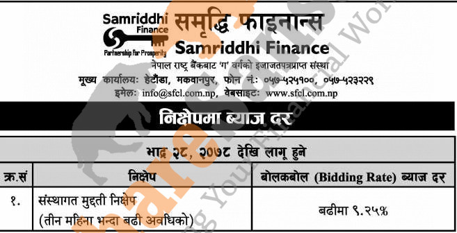 Samriddhi Finance Limited has published a notice regarding the new interest rate on deposit product and it's effective from 28th Bhadra, 2078.