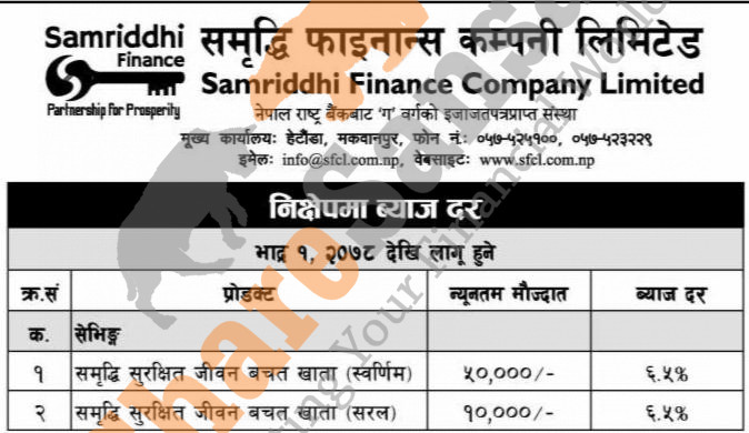 Samriddhi Finance Limited has published a notice regarding the new interest rate on deposit products and it's effective from 1st Bhadra, 2078.