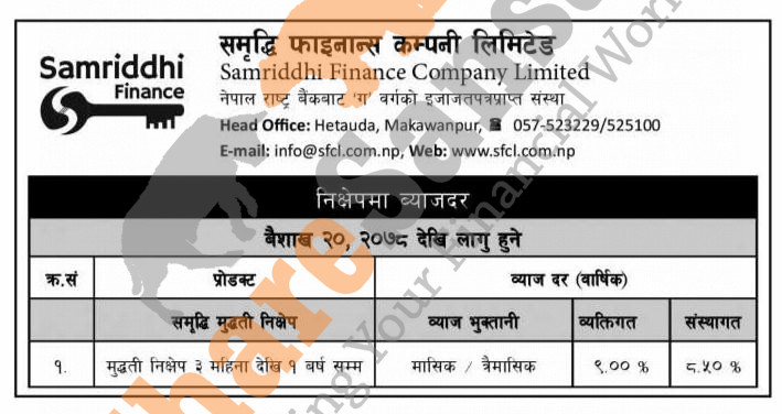 Samriddhi Finance Limited has published a notice regarding the new interest rate on deposit products and it's effective from 20th Baisakh, 2078.
