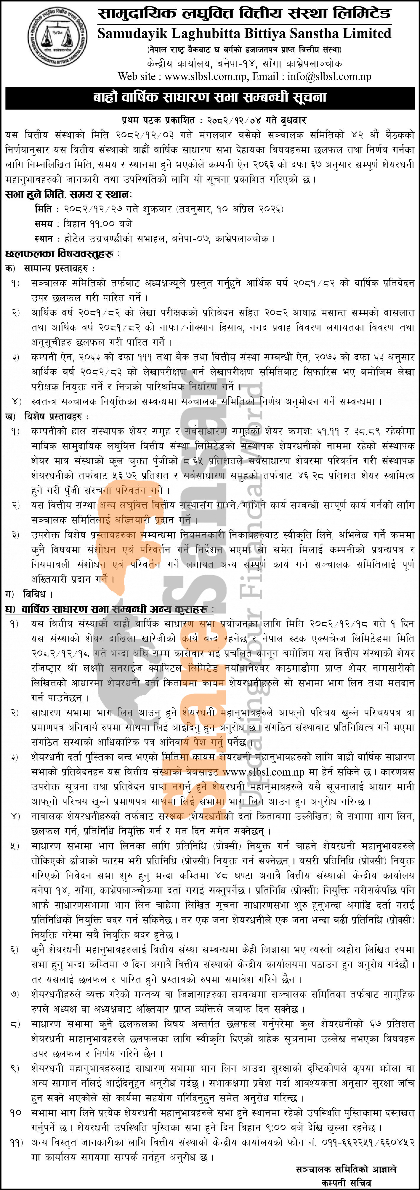 Samudayik Laghubitta Bittiya Sanstha Limited has announced its 12th AGM going to be held on 27th Chaitra, 2082.