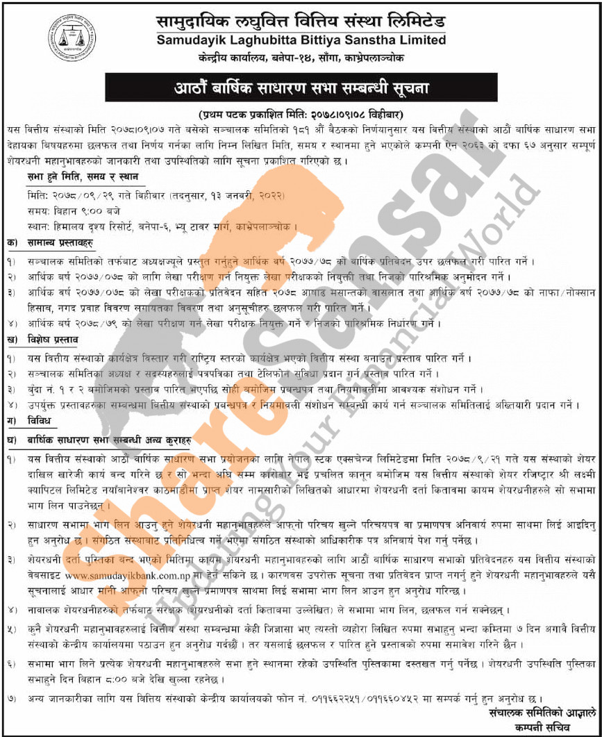Samudayik Laghubitta Bittiya Sanstha Limited has announced its 8th AGM going to be held on 29th Poush, 2078.