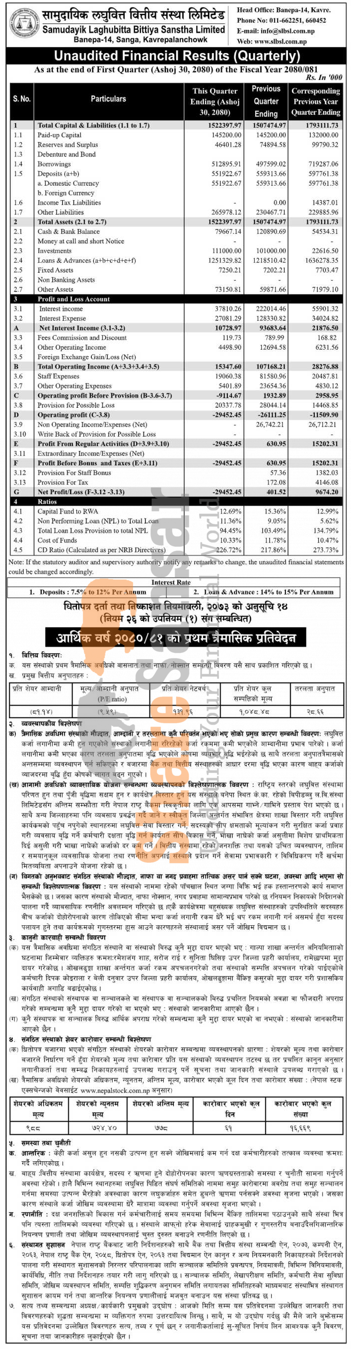 Samudayik Laghubitta Bittiya Sanstha Limited has posted a net loss of Rs 29.45 million and published its 1st quarter company analysis of the fiscal year 2080/81.
