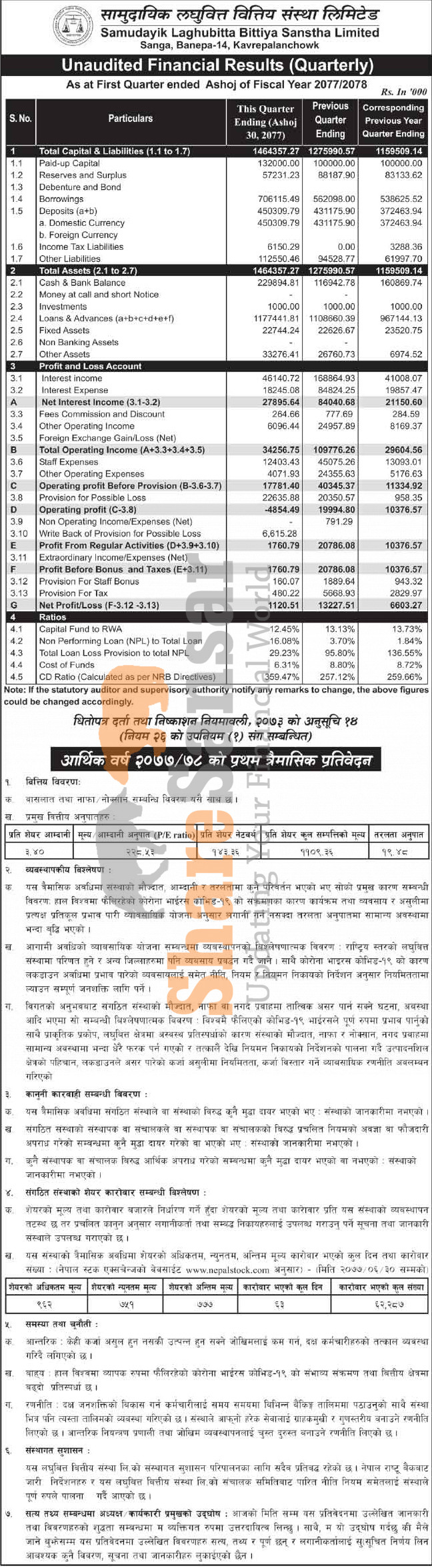 Samudayik Laghubitta Bittiya Sanstha Limited has posted a net profit of 1.12 million and published its 1st quarter company analysis of the fiscal year 2077/78.