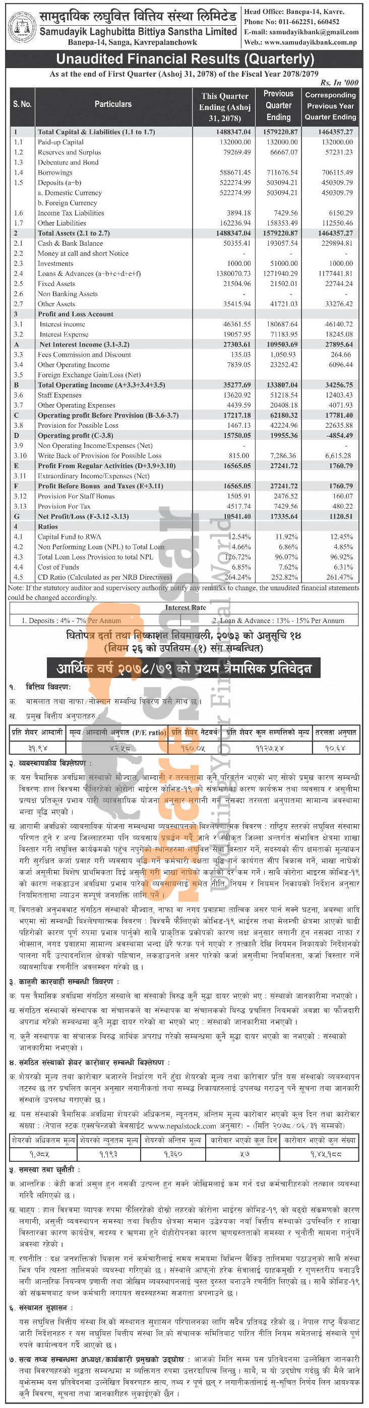 Samudayik Laghubitta Bittiya Sanstha Limited has posted a net profit of Rs 10.54 million and published its 1st quarter company analysis of the fiscal year 2078/79.