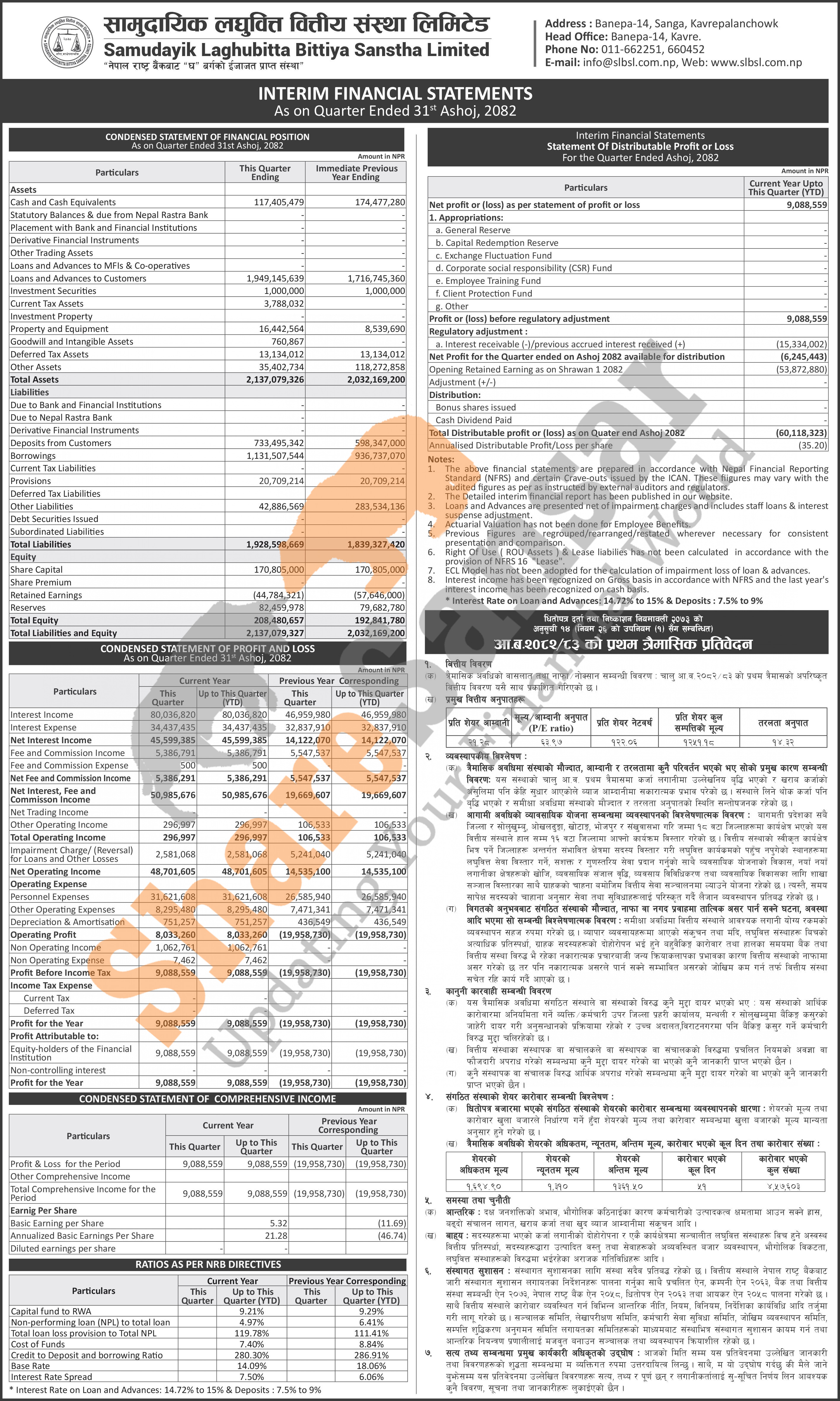 Samudayik Laghubitta Bittiya Sanstha Limited has posted a net profit of Rs 9.08 million and published its 1st quarter company analysis of the fiscal year 2082/83.
