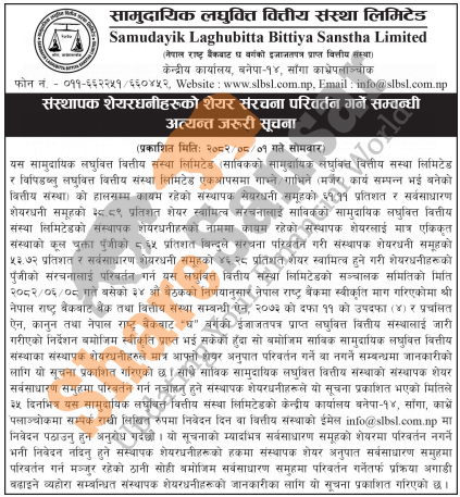 Samudayik Laghubitta Bittiya Sanstha Limited has published a notice to its promoter shareholders regarding the conversion of the share structure ratio.