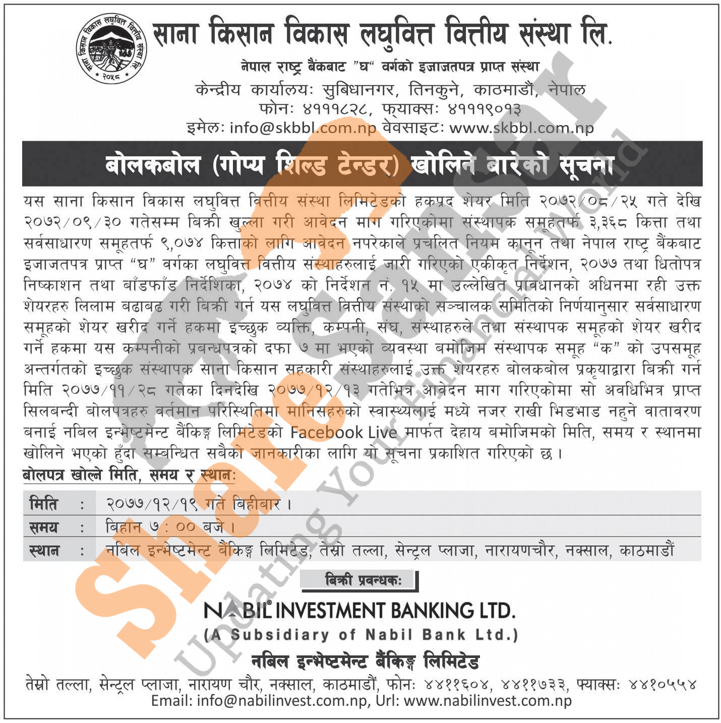 Sana Kisan Bikash Laghubitta Bittiya Sanstha Limited has published bid opening date of its 3,368 units promoter right share and 9,074 units ordinary right share in an auction to the general public on 19th Chaitra, 2077 ie. today.