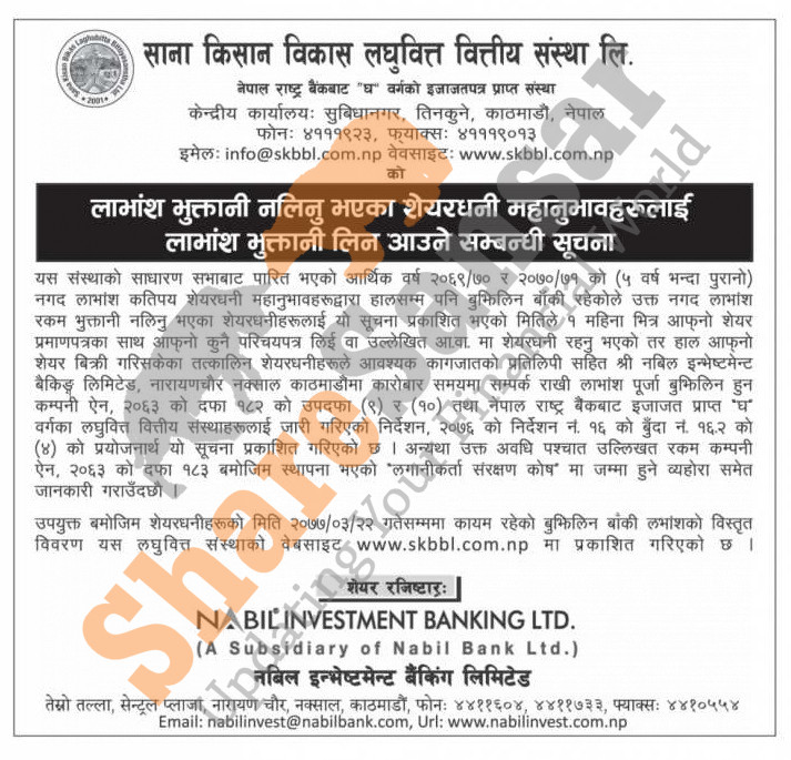 Sana Kisan Laghubitta Bittiya Sanstha Limited urges its shareholders to collect uncollected due dividend.
