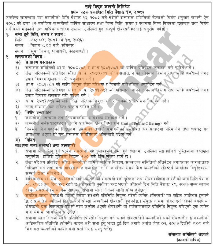 Sangay Hydropower Company Limited has announced its AGM going to be held on 4th Jestha, 2083.