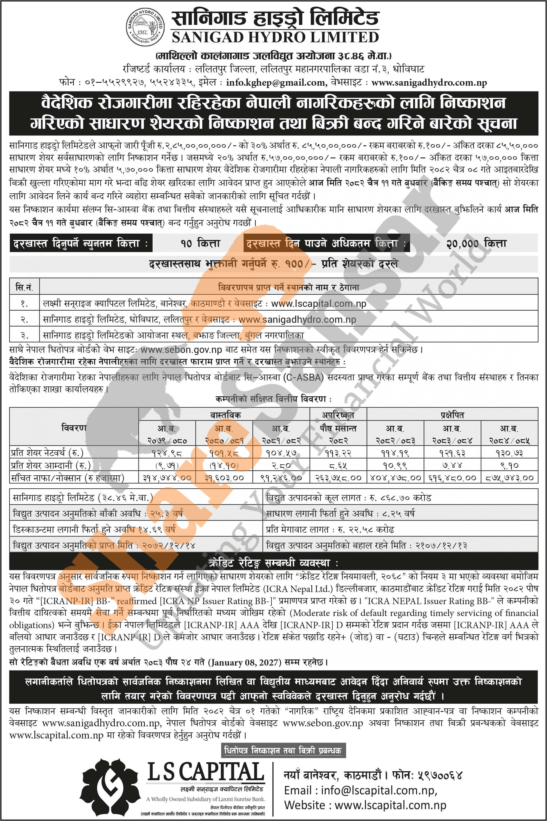 Sanigad Hydro Limited is closing its 5,70,000 units IPO Shares to Foreign Nepalese Employees from today (11th Chaitra, 2082).