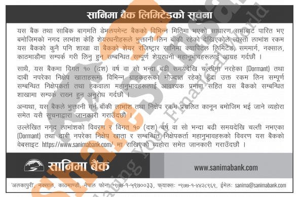 Sanima Bank Limited (former Bagmati Development Bank Limited) has published a notice to collect uncollected due dividend to its shareholders.