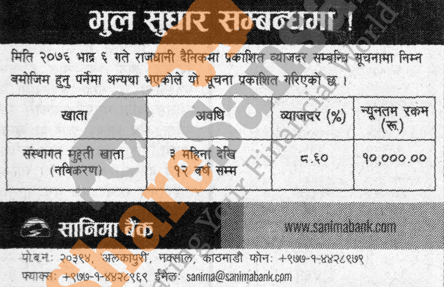 Sanima Bank Limited has amended its Interest rate notice.