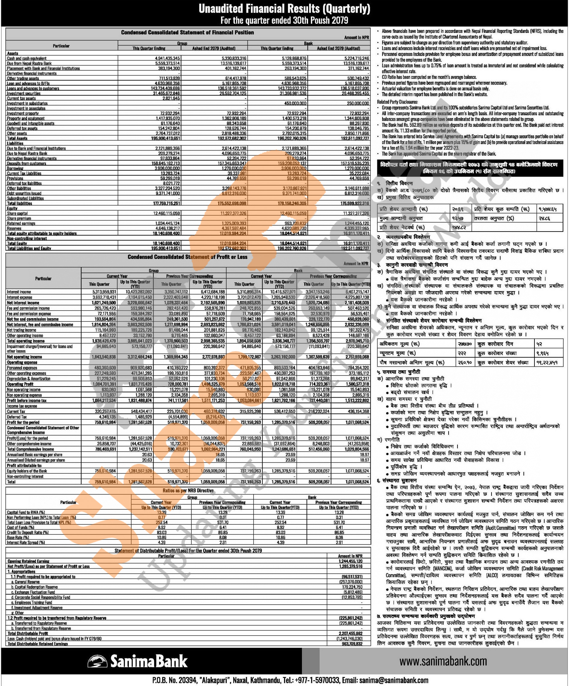 Sanima Bank Limited has posted a net profit of Rs 1.24 billion and published its 2nd quarter company analysis of the fiscal year 2079/80.