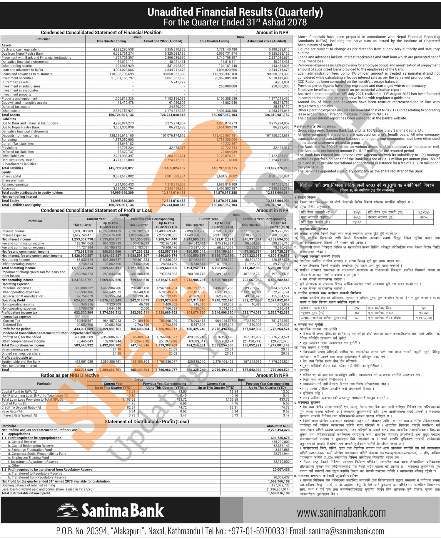Sanima Bank Limited has posted a net profit of Rs 2.27 billion and published its 4th quarter company analysis of the fiscal year 2077/78.