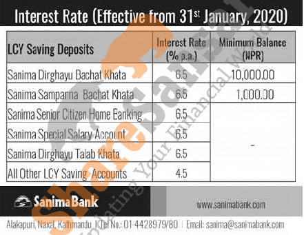 Sanima Bank Limited has published a notice regarding new interest rate and its effective from 17th Magh, 2076.