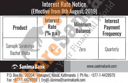 Sanima Bank Limited has published a notice regarding new interest rate and its effective from 22nd Bhadra, 2076.