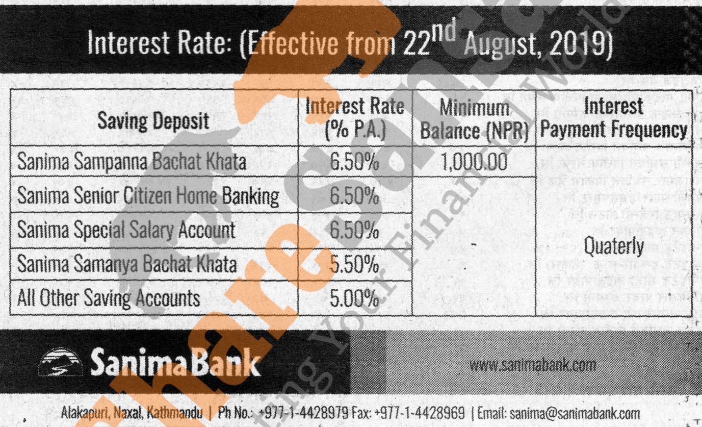 Sanima Bank Limited has published a notice regarding new interest rate and its effective from 4th Bhadra, 2076.